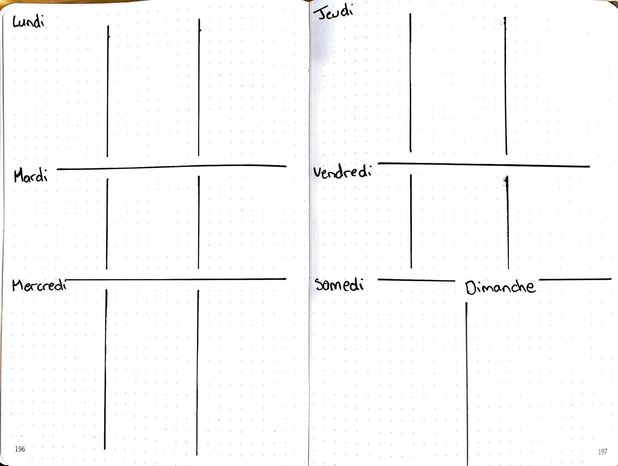 Pour ma part, j’ai ajouté au système du Bujo une feuille de route hebdomadaire. Cette collection ne fait pas partie du système original, mais après avoir pas mal testé, avec ou sans, je ne peux plus faire sans aujourd’hui. C’est dans cette collection que j’utilise la technique de Time Blocking. Pour la semaine en cours, je me bloque des tranches d’heures. Aujourd’hui, j’ai 3 blocs par jour de la semaine qui sont dédiés à mes activités personnelles :