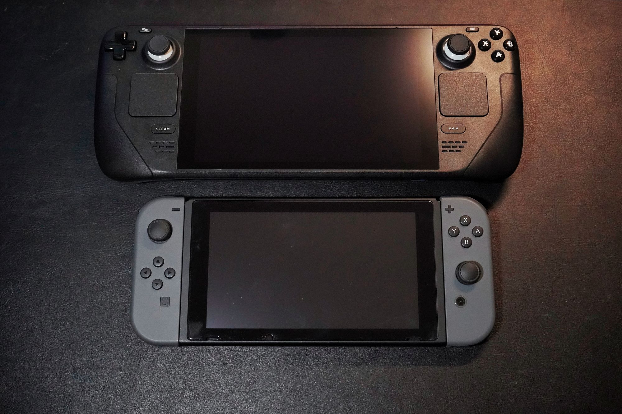 Premier constat, le Steam Deck est imposant ! C’est clairement l’appareil mobile le plus imposant que j’ai pu avoir l’occasion d’avoir entre les mains. La comparaison avec la Nintendo Switch est assez parlante je pense.