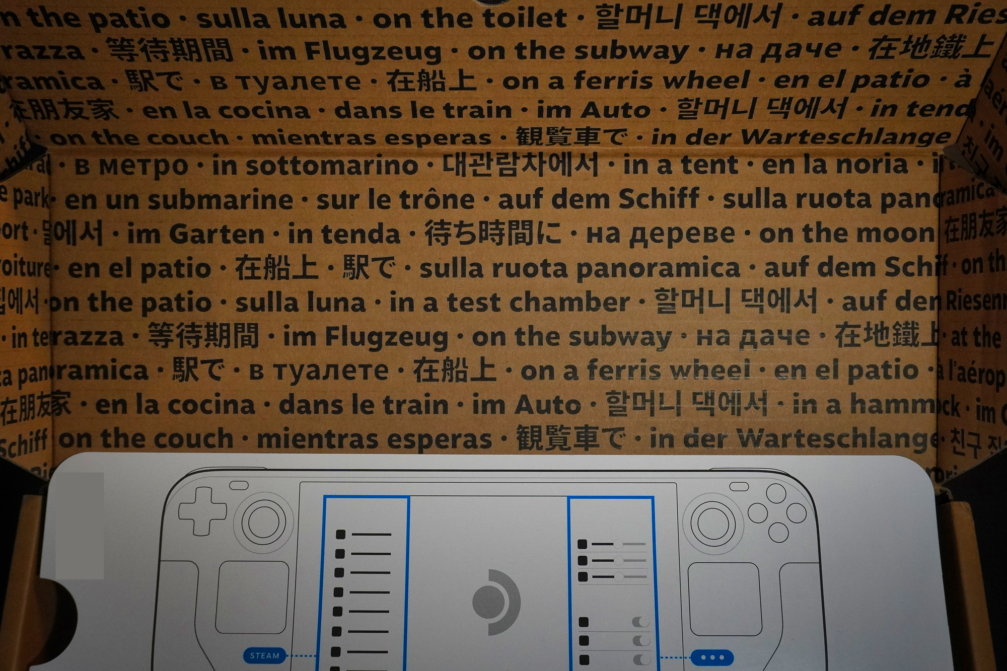 Le Steam Deck arrive dans un carton sur lequel on peut lire de multiples propositions d’endroits où jouer avec son nouvel appareil, et cela, dans plusieurs langues. Le bijou de technologie est livré dans son écrin de protection : une très belle pochette, solide, qui permet de la transporter sans crainte dans un sac à dos. Et pour finir, le cordon d’alimentation qui vient directement avec la prise sélectionnée lors de la commande pour le raccordement au secteur.